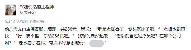 这是知乎上看到的:前几天去肉店灌香肠,结账一共 元。我说:“都是老顾客了,零头就抹了吧。”老板也很爽快:“行,凑个整,你给 块吧。”我顿时